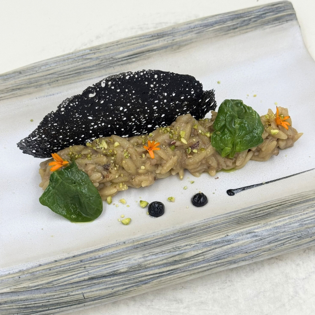 Falso risotto de queso azul QUESERÍA LUSURI, con ali-oli de ajo negro FAMILIA SUAREZ, AOVE D.O. BAENA, coral y pistacho