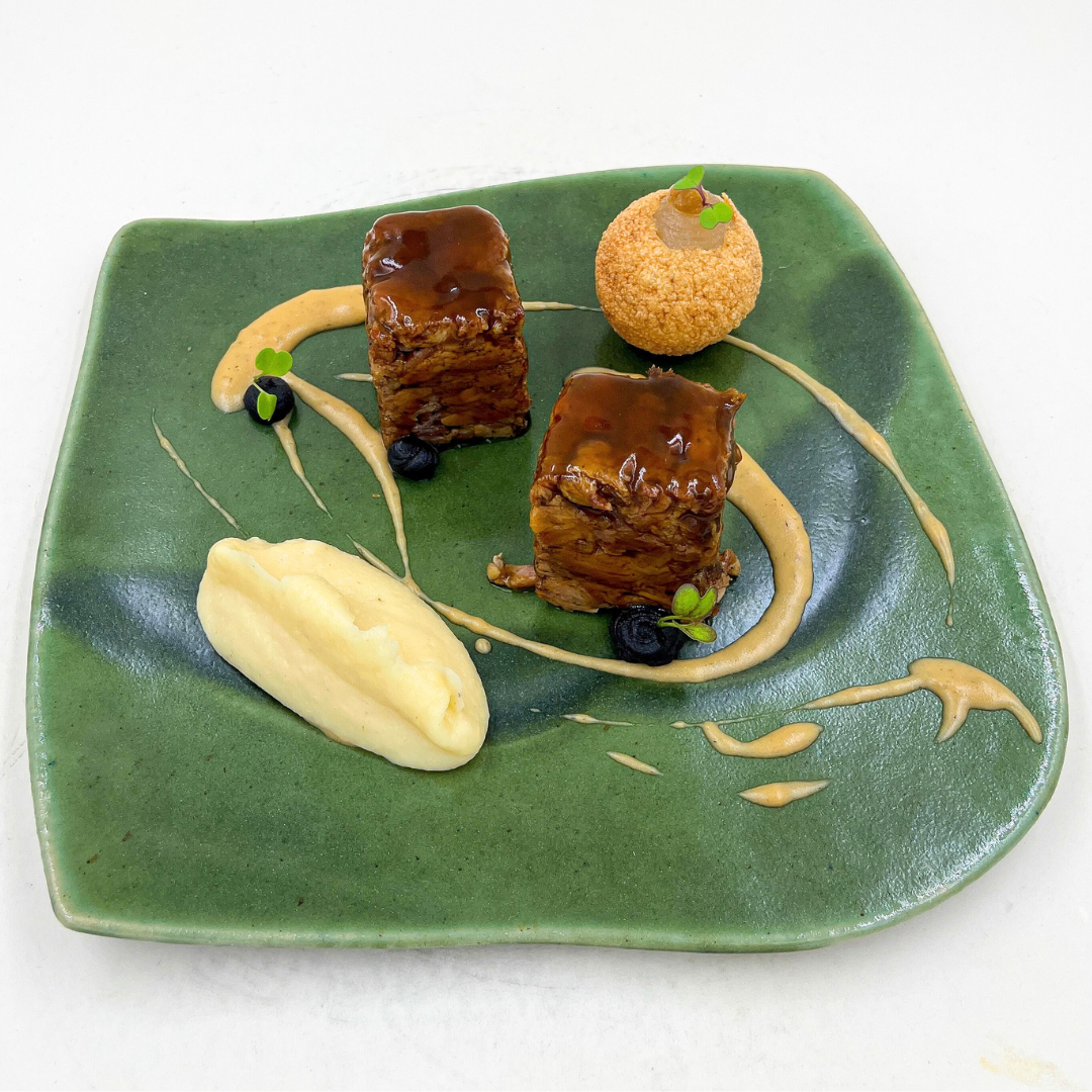 Lingote de cabrito ENTRECABRITOS sobre puré de apionabo, con salsa de vermout a la sidra BIO-K, emulsión de ajo negro DAONAZ y panipuri relleno de gel de piña al romero